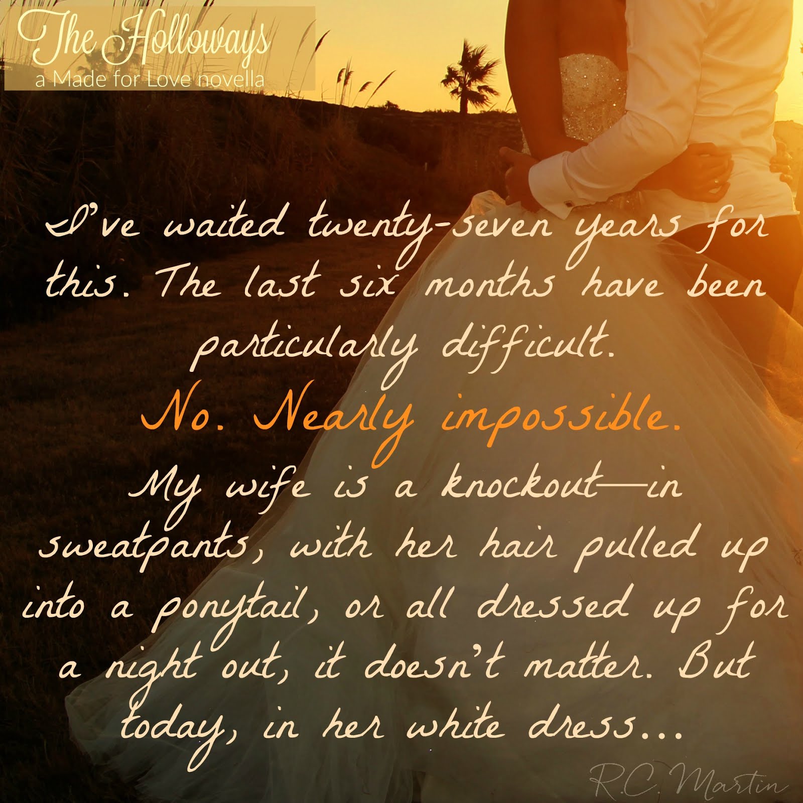My chest tightens with longing. It’s been a feeling I’ve been fighting all day. I’ve waited twenty-seven years for this. The last six months have been particularly difficult. No. Nearly impossible. My wife is a knockout—in sweatpants, with her hair pulled up into a ponytail, or all dressed up for a night out, it doesn’t matter. But today, in her white dress…