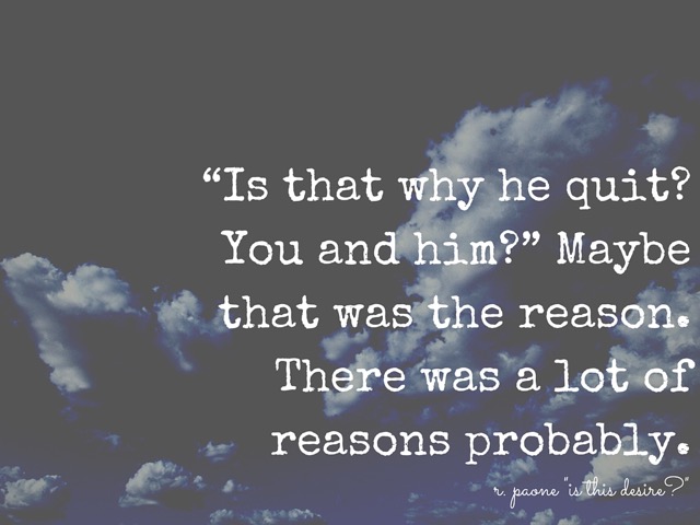 Even though it was only a text message, I began to imagine the words coming out of his mouth, the tone of his voice. Almost like he was a couple inches in front of me or something, holding my hands and pleading with me to come to him. Grace him with my presence. It wasn’t only just the text that distracted me and upsetter my stomach only more, it was the way he wrote the message. The simplicity of the text, the punctuation for some reason drove me crazy like there was desperation looming. He wasn’t asking me to just come over, he was stating that I come. It was punctuated with a period. Full sentence, stop.