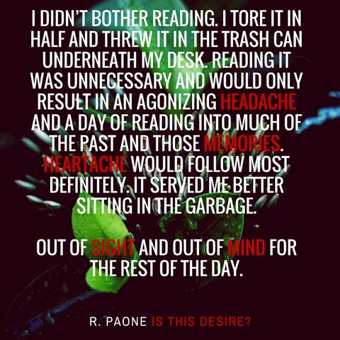 Even though it was only a text message, I began to imagine the words coming out of his mouth, the tone of his voice. Almost like he was a couple inches in front of me or something, holding my hands and pleading with me to come to him. Grace him with my presence. It wasn’t only just the text that distracted me and upsetter my stomach only more, it was the way he wrote the message. The simplicity of the text, the punctuation for some reason drove me crazy like there was desperation looming. He wasn’t asking me to just come over, he was stating that I come. It was punctuated with a period. Full sentence, stop.