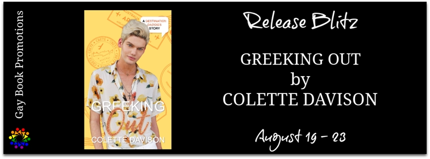 Greeking Out is a long-distance-friends-to-lovers story with a geeky boy who hasn’t been little in too long, a confident, caring Daddy who wants to give his boy the holiday of a lifetime, and a well-loved teddy bear. It’s part of the Destination Daddies multi-author series. Each book can be read as a standalone, but there are so many destinations and Daddies to discover, why not grab them all?